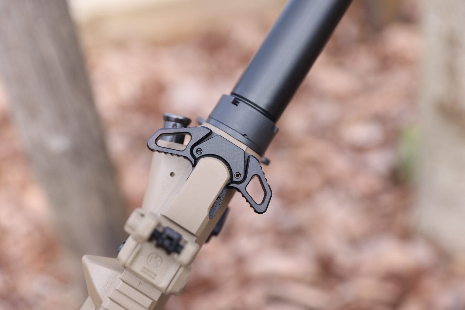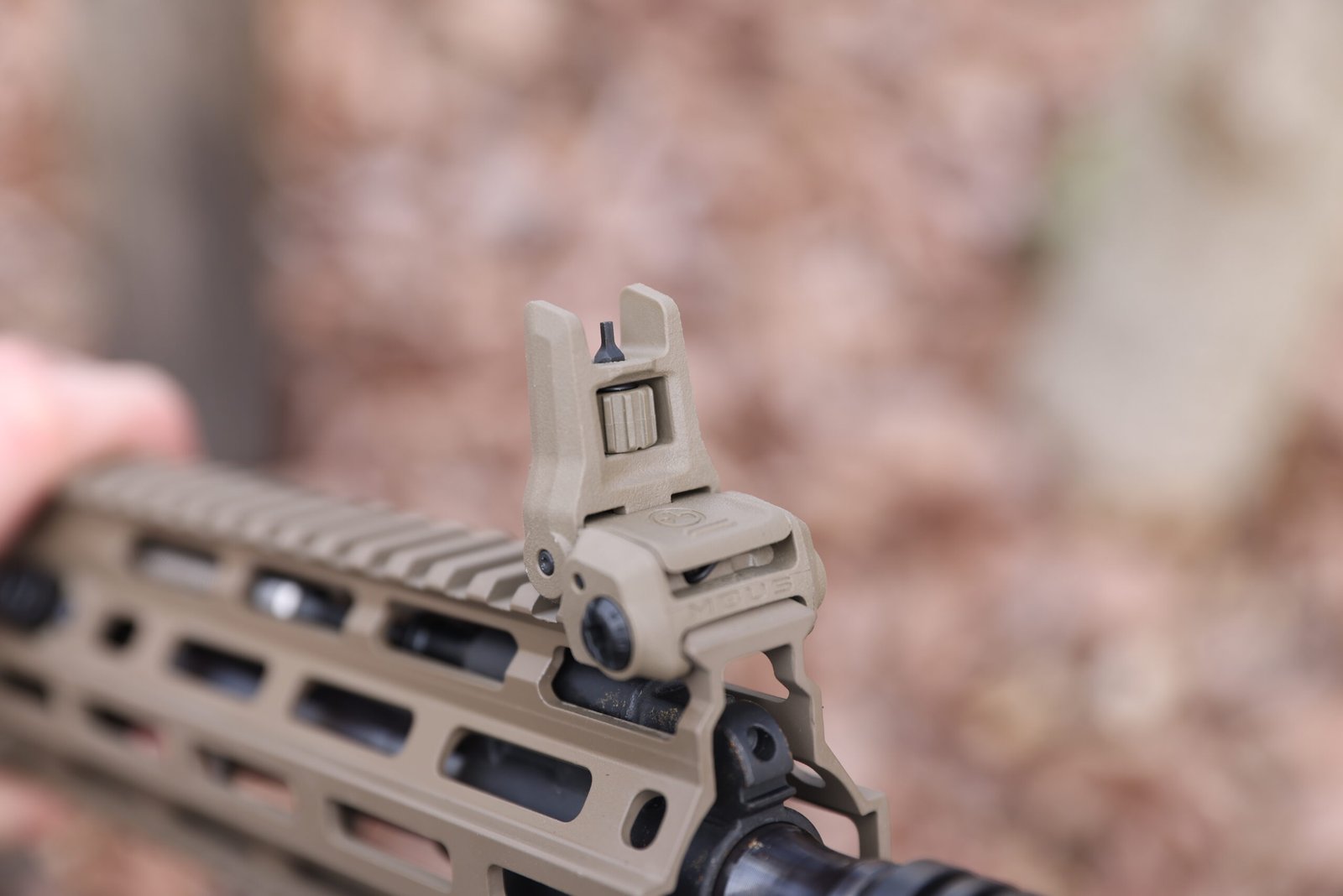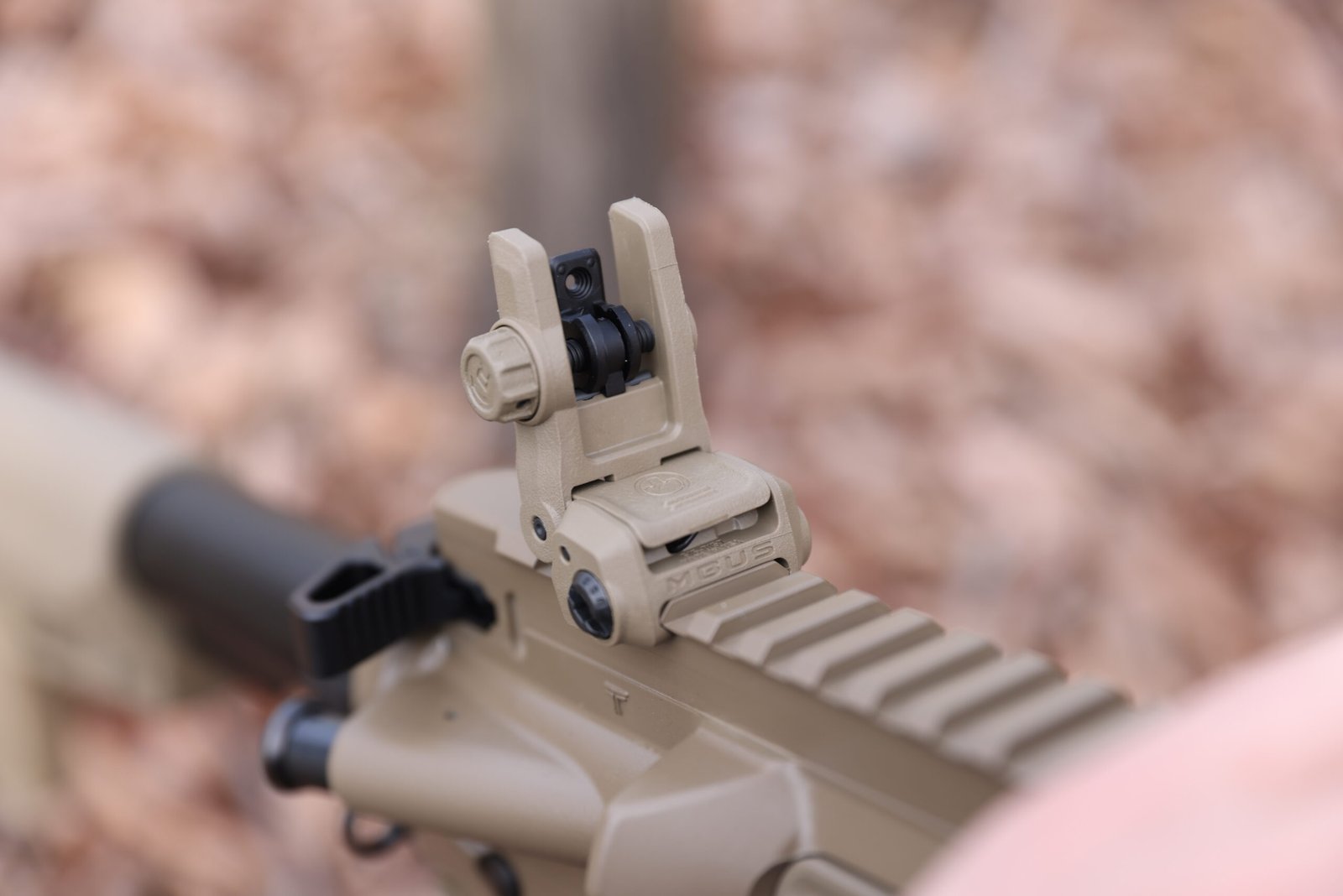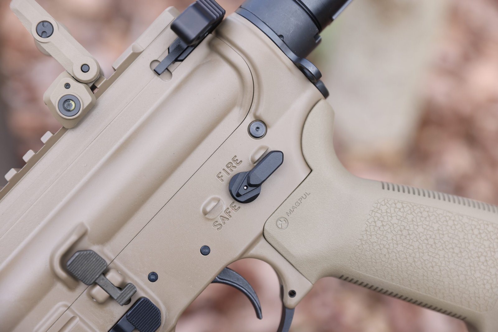 Une arme extrêmement ajustée, proposée ici avec un sélecteur de tir à 45 degrés et ambidextre, un charging handle ambidextre, des organes de visée Magpul MBUS d’origine, ainsi qu’une crosse et poignée Magpul.
